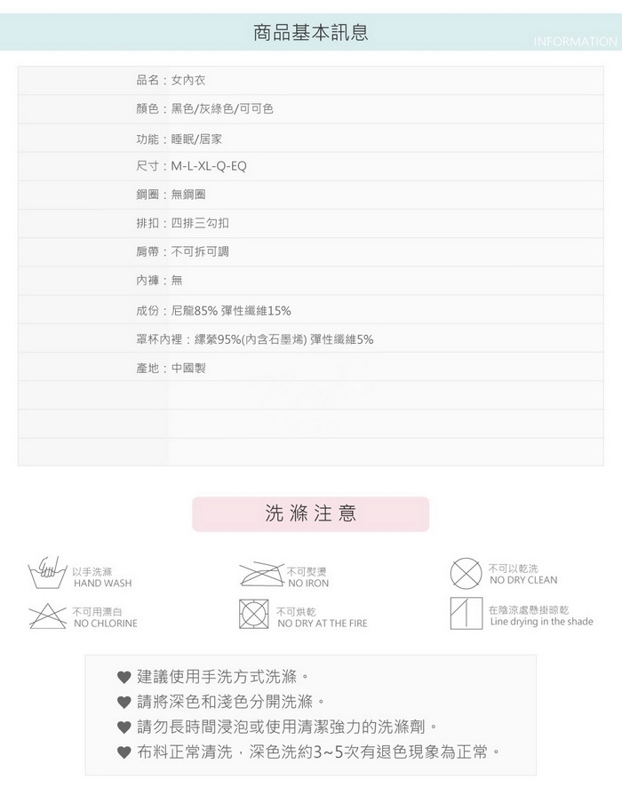 ‧洗滌時建議使用中性洗潔劑手洗,不可長時間浸泡再洗滌。