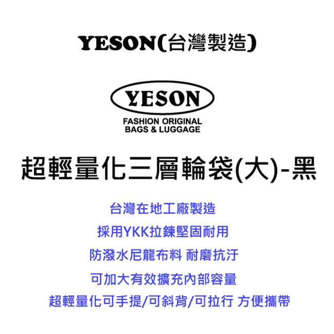 品名:【YESON 永生】超輕量化可登機三層輪袋(大)-黑色