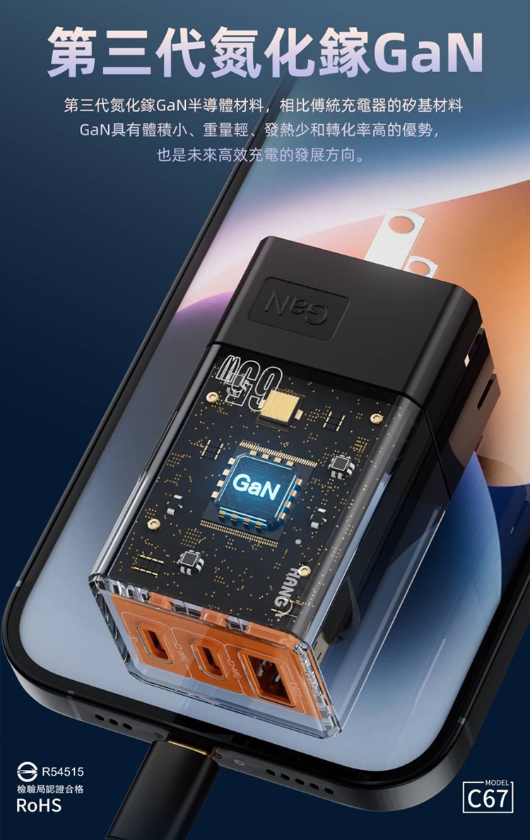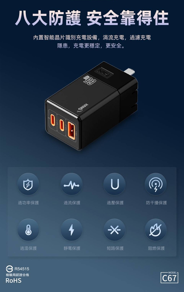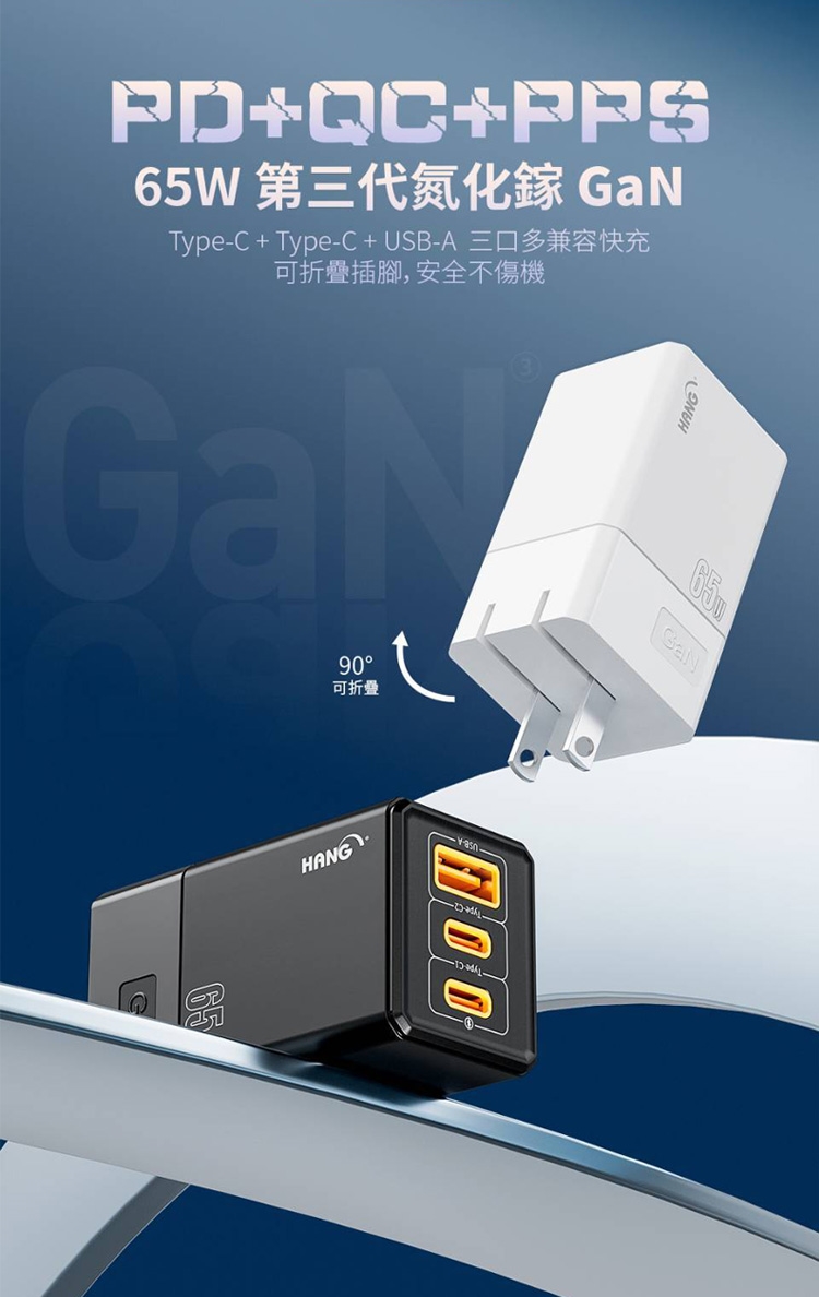 HANG 三代氮化鎵65W 白色+勇固線耐彎折編織線USB-Type-C-120cm