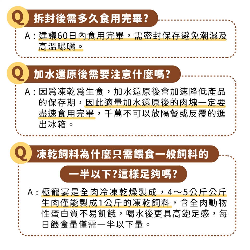 ● 餵食方式|拆封後即可食用,建議剝成適合毛孩食用的大小餵食。可當作零食餵食, 也可當作保健營養品加入飼料中能增添風味及豐富營養,還可加水還原成鮮食食用