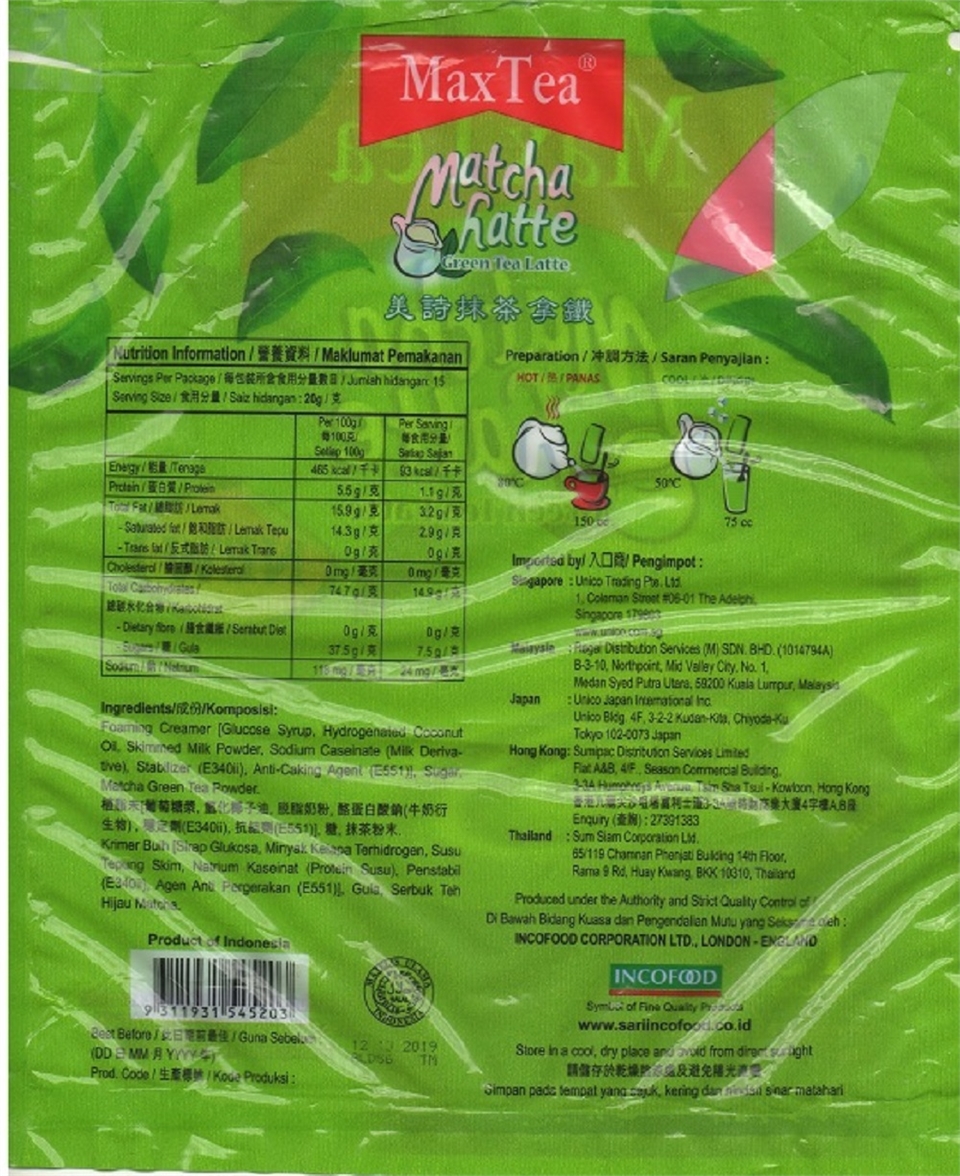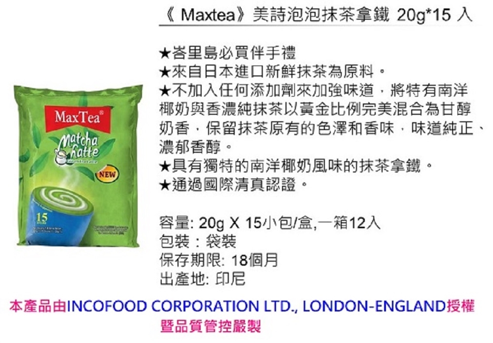由印尼原廠原裝進口,秉持高質量是對消費者信賴的承諾。從監控原材料質量到包裝。所有包裝材料的質量也經過精心挑選,以確保向消費者提供高質量及保質期的產品。MaxTea抹茶拿鐵秉持嚴選茶葉的職人精神,揀選優質日本抹茶搭配專業技術,以手工花崗岩磨石機研磨出新鮮乾燥的抹茶,透過專業技術控制研磨速度及溫度,降低研磨製程中抹茶風味和顏色的耗損,保留抹茶最原始色澤及茶香。搭配獨家拉茶濃郁奶泡技術完美結合,讓您在家就能享受美味如鮮的抹茶拿鐵飲品。不使用著色劑、人造甜味劑和防腐劑。冷、熱均可沖泡出濃郁奶泡的純正東南亞風味拉茶,MaxTea帶給您印尼拉茶最原始及新鮮的風味。純正東南亞風味拉茶已是印尼、馬來西亞、泰國暢銷品牌,更行銷全球30多國。並通過穆斯林Halal認證、ISO 22000、ISO 17025及BPOM Processed Food Distribution Permit等認證,暢銷全球數十年一直深獲消費者熱愛,更是峇里島必買伴手禮 。