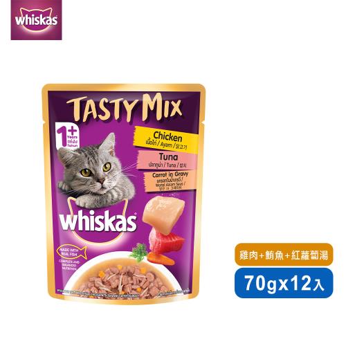 【Whiskas偉嘉】什錦珍味妙鮮包 雞肉、鮪魚及紅蘿蔔湯汁 70g*12入 寵物/貓罐頭/貓食