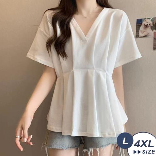 【LANNI 藍尼】★別緻V領壓褶顯瘦上衣(休閒/短袖/春夏)