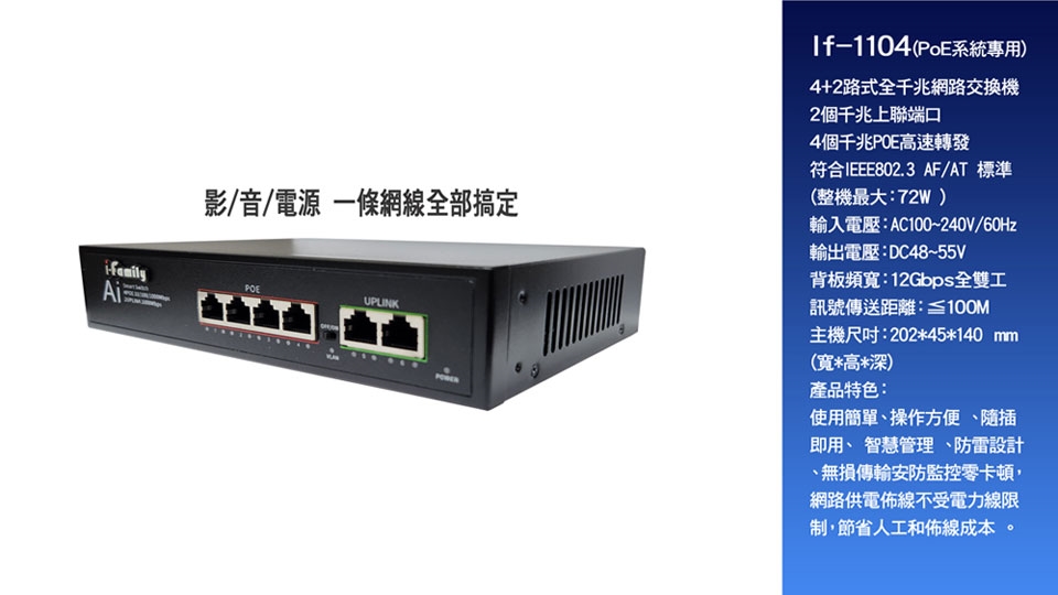 使用簡單、操作方便、隨插即用、智慧管理、防雷設計、無損傳輸安防監控零卡頓,網路供電佈線不受電力線限制,節省人工和佈線成本。