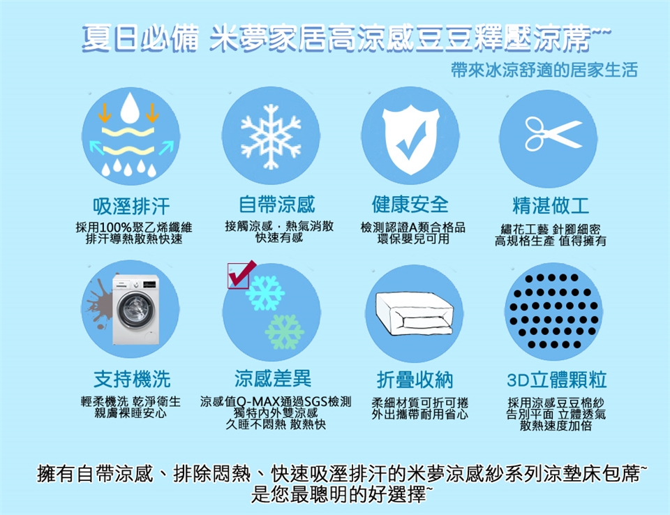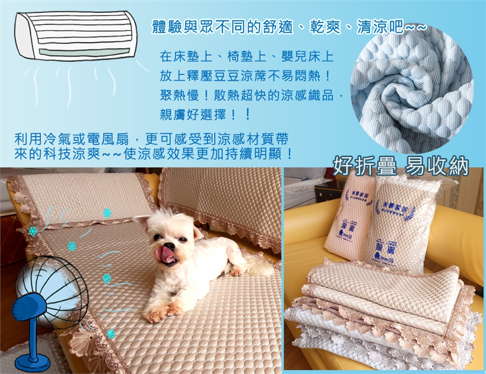 【米夢家居】最新推出 瞬間涼感軟床專用-可機洗好收納雙涼感3D豆豆釋壓床包涼蓆、木椅專用涼蓆坐墊等商品。具有親膚舒適、吸溼排汗、散熱快速特色,接觸立馬涼感,且因內外材質雙涼感,所以久睡坐久都不易悶熱!散熱超快速~~