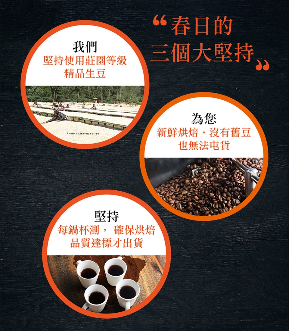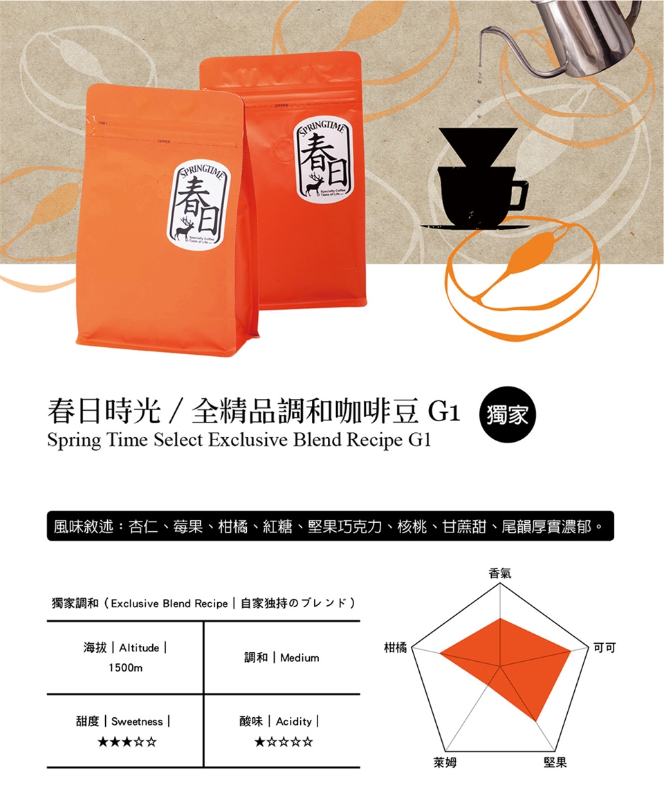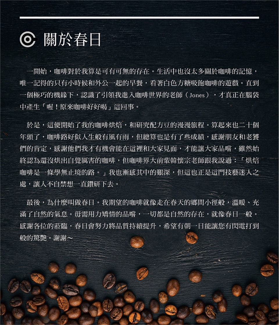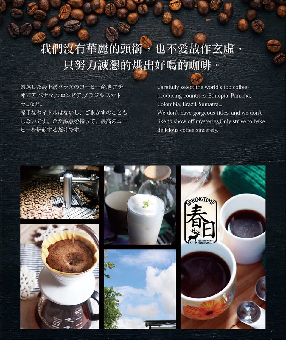 食用方式:視自行需求依沖泡及磨粉器具,選擇合適的研磨刻度,研磨成咖啡粉後沖泡品嚐