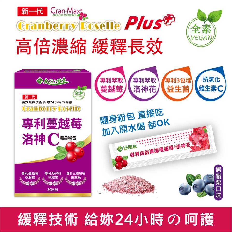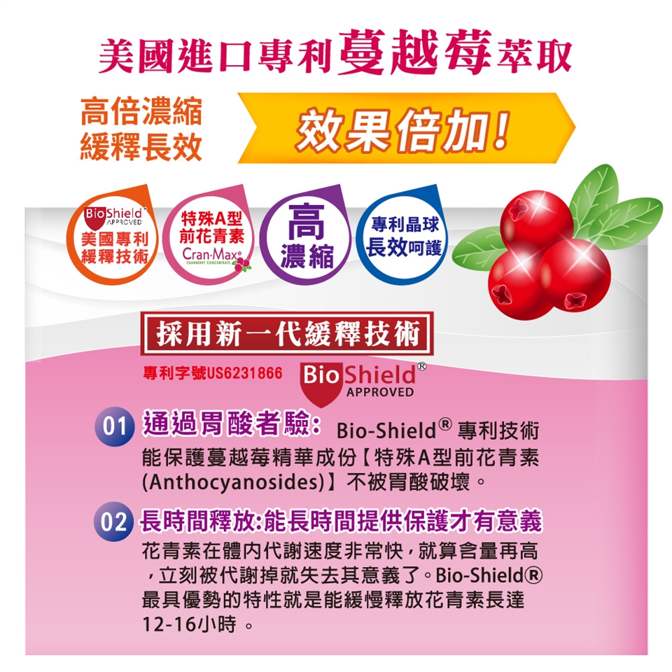 ◆嚴選北美紅寶石Cran-Max®專利蔓越莓,高倍濃縮全果實萃取,含有豐富的「特殊A型花青素」。
