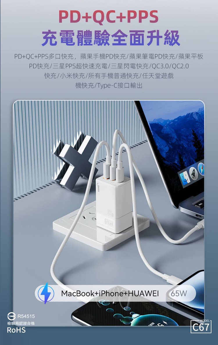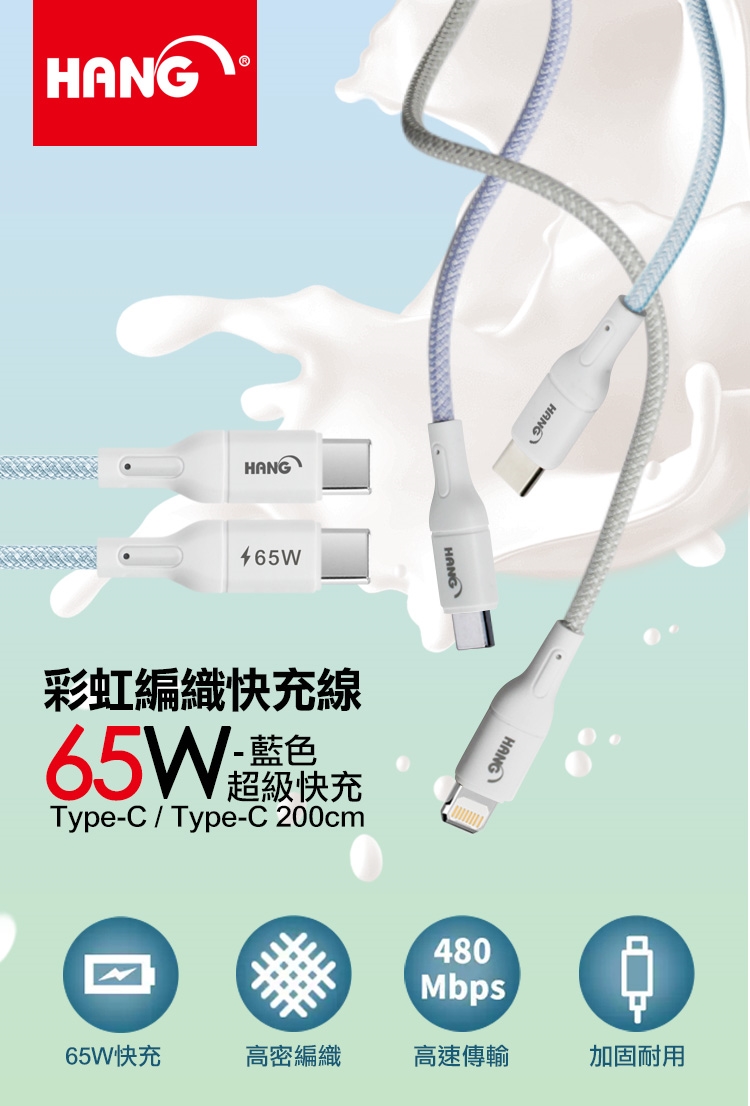 HANG 三代氮化鎵65W 黑色+高密編織線Type-C to Type-C充電線-200cm