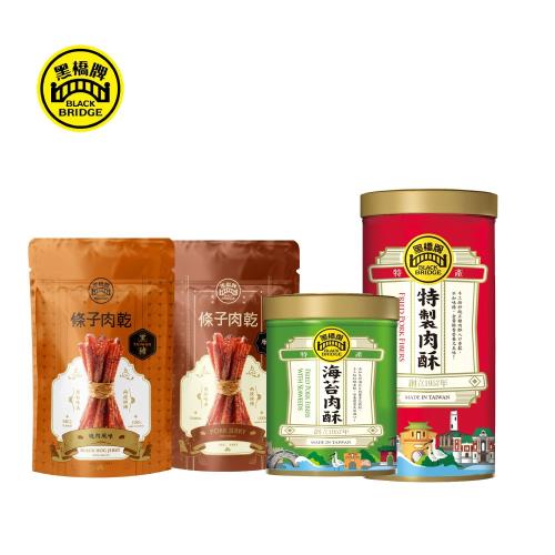 【黑橋牌】超人氣四件組(大肉酥罐*1+海苔肉酥-小罐*1+原味厚燒條子肉乾*1+黑豬燒肉條子肉乾*1)