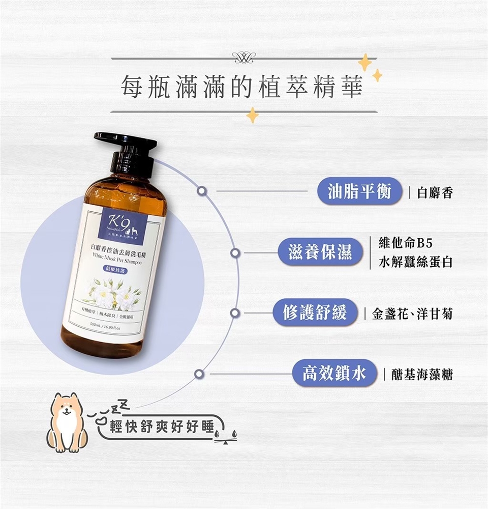 • 運用多種天然植萃精華保濕修護、舒緩乾癢。適合於油脂失調、乾癢不止的狗貓們。