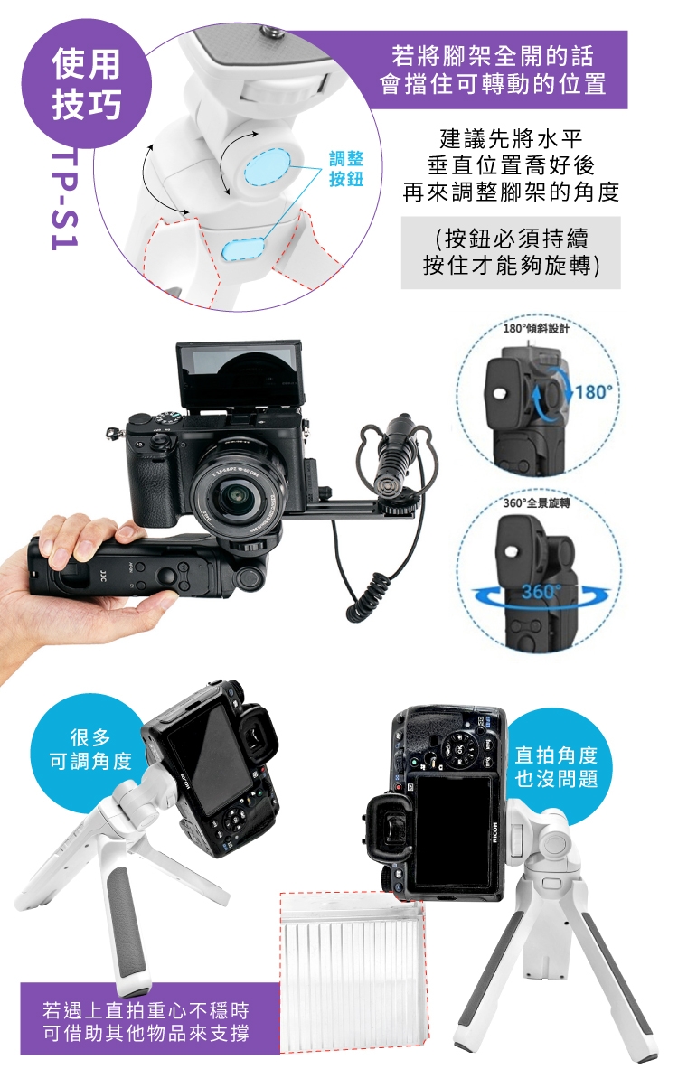 ●雲台可360度全景旋轉及180度傾斜,讓拍攝角度多樣化。