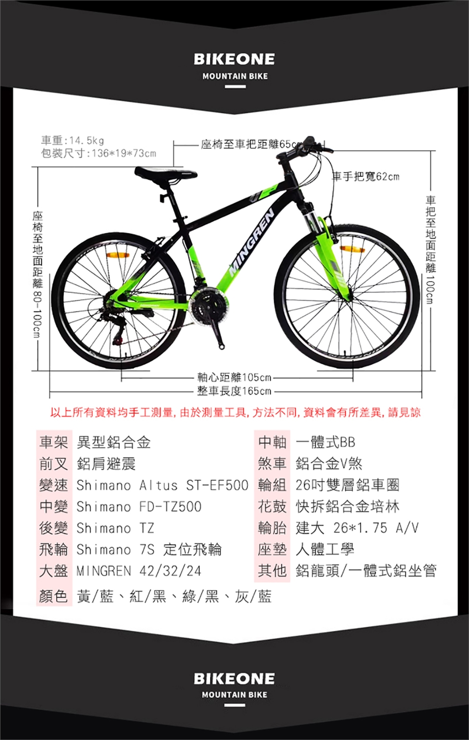 輪組:26吋*1.75吋 雙層CNC鋁車圈+鋁合金花鼓(培林)+前後快拆