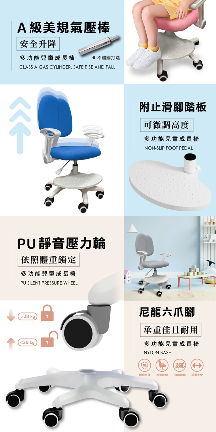 採用A級美規氣壓棒、安全升降,附止滑學童腳踏板、可微調高度,搭配尼龍六爪腳、承重佳且耐用,