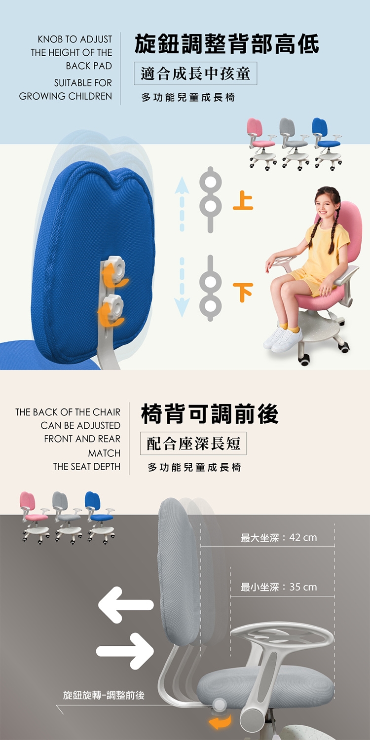 * 背高以旋鈕微調高低、適合成長