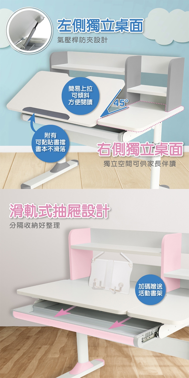 簡易上拉可以傾斜45度方便閱讀,桌面附有可黏貼書擋書本不滑落,右側獨立桌面空間可供家長伴讀,
