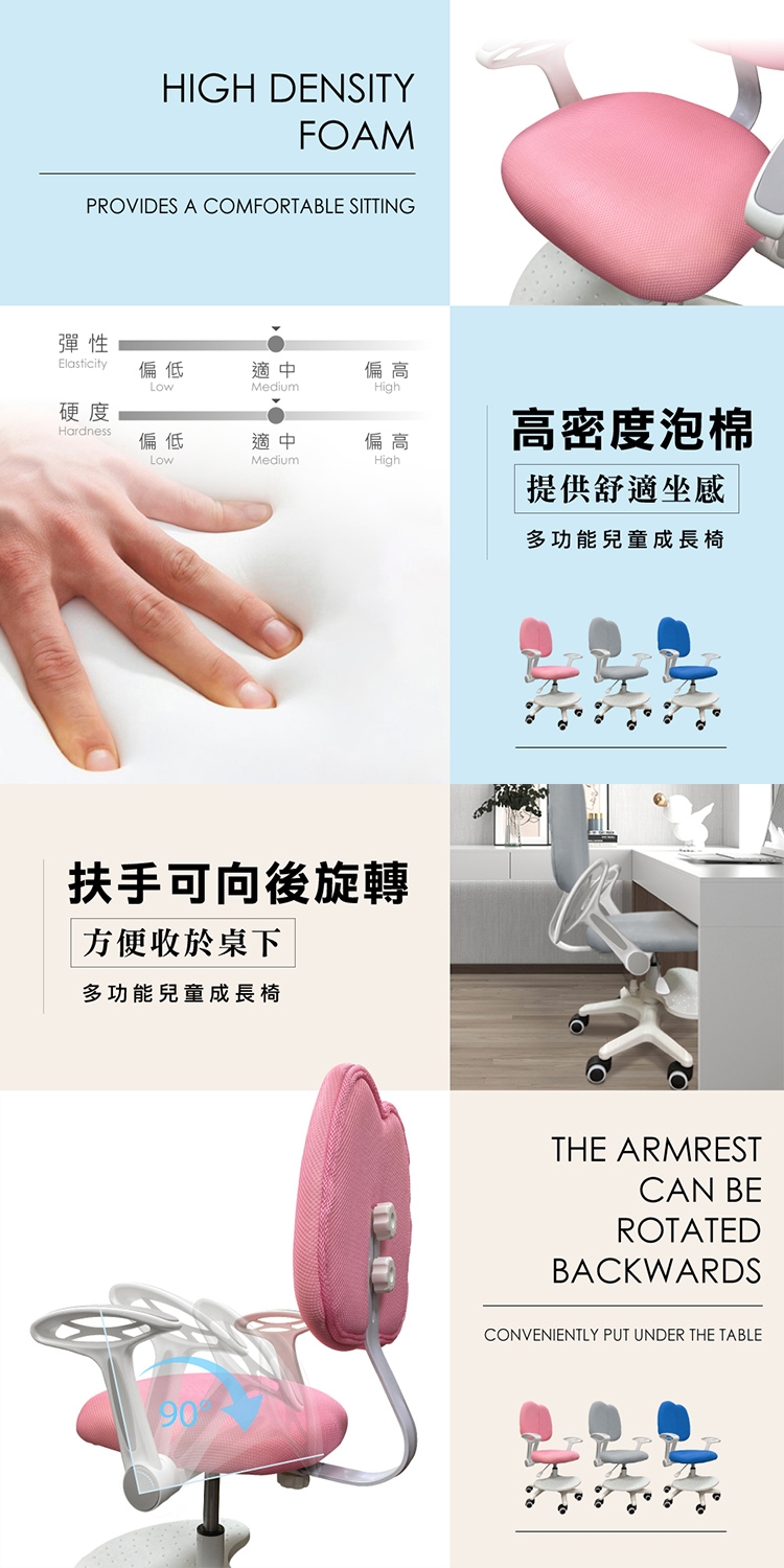 可調前後伸縮椅背配合座深長短,泡棉椅背及坐墊,提供舒適坐感,扶手可向後旋轉、方便收於桌下,