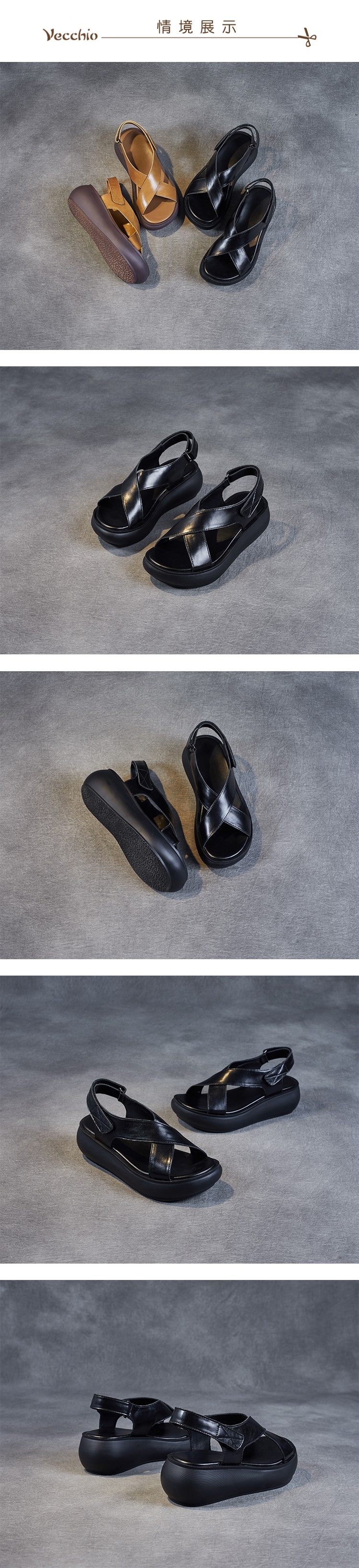【VECCHIO】涼鞋 厚底涼鞋/全真皮頭層牛皮經典交叉厚底魔鬼粘涼鞋 黑