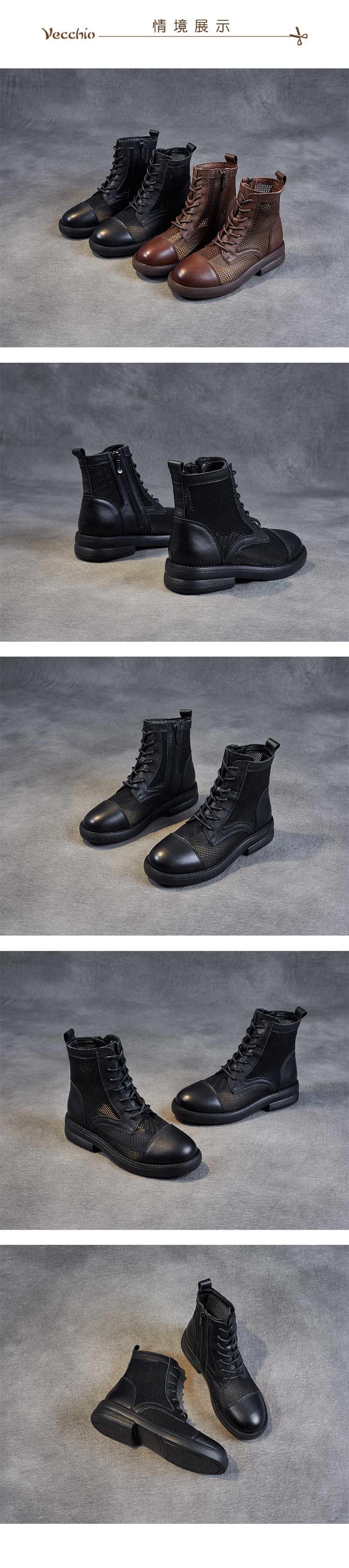 【VECCHIO】馬丁靴 粗跟馬丁靴/全真皮頭層牛皮透氣網布拼接時尚粗跟馬丁靴 黑