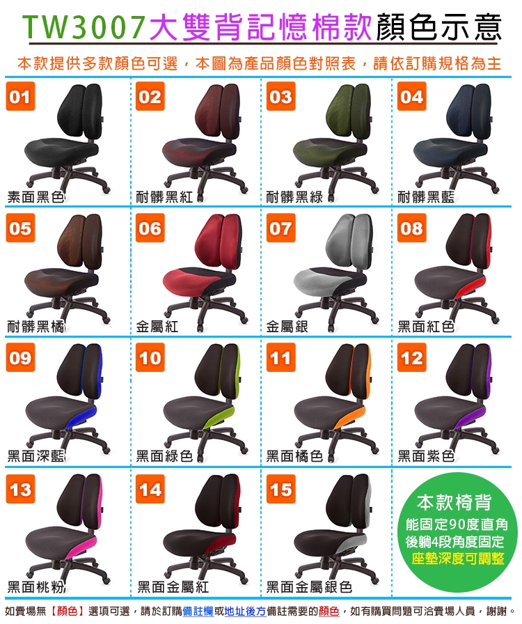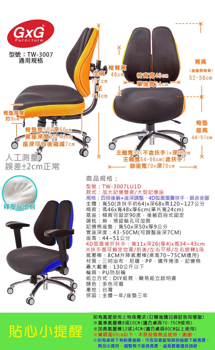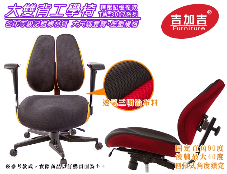 TW-3007低背款雙背椅,本款使用名床等級釋壓記憶泡棉,適合身高155~190CM使用者,椅背採用人體工學設計,造型看似烏魚子、或是像兩個人體肺的型狀,這樣的設計,是讓我們在乘坐後靠時,能更貼合我們背部,緩和脊椎的重力,降低尾椎壓力,給長時間工作者一張,聰明、會改善坐姿習慣的智慧椅。