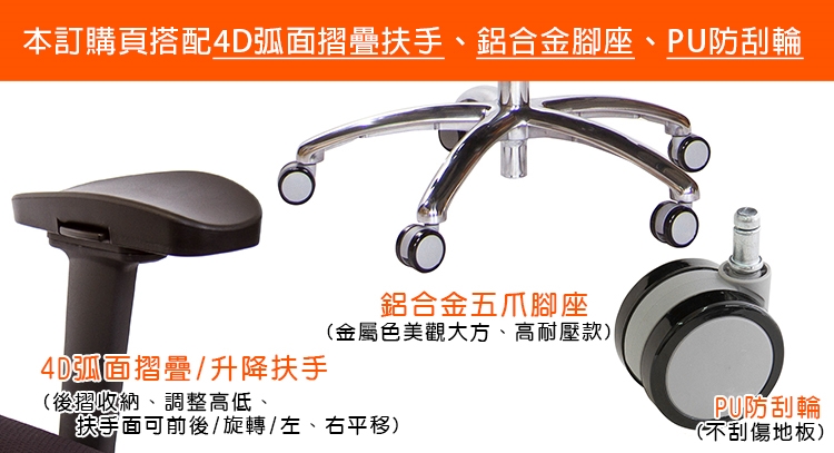 本訂購頁規格:4D"弧面"摺疊/升降扶手、鋁合金腳座、PU防刮滑輪