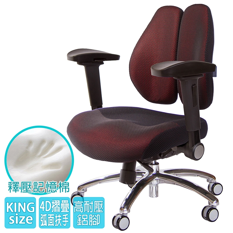 人體工學雙背設計,改善長時間座在椅子上,覺得腰部貼合度不足,有懸空或不夠沉穩的感覺,改良式的雙背背墊,除了完整包覆性外,更提供了『左右彈性』、『上下貼合』、『彈力緩衝』等特性,並有多國國際結構專利認證(台灣、德國、日本、美國、中國等),原廠專利、技術100% Made in Taiwan台灣製造。