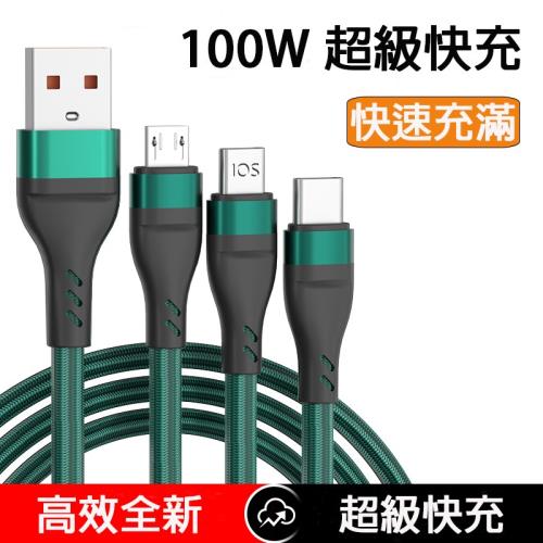 超耐用新款 100W快充3合1尼龍編織繩 1.2公尺 Lightning TYPE-C Micro