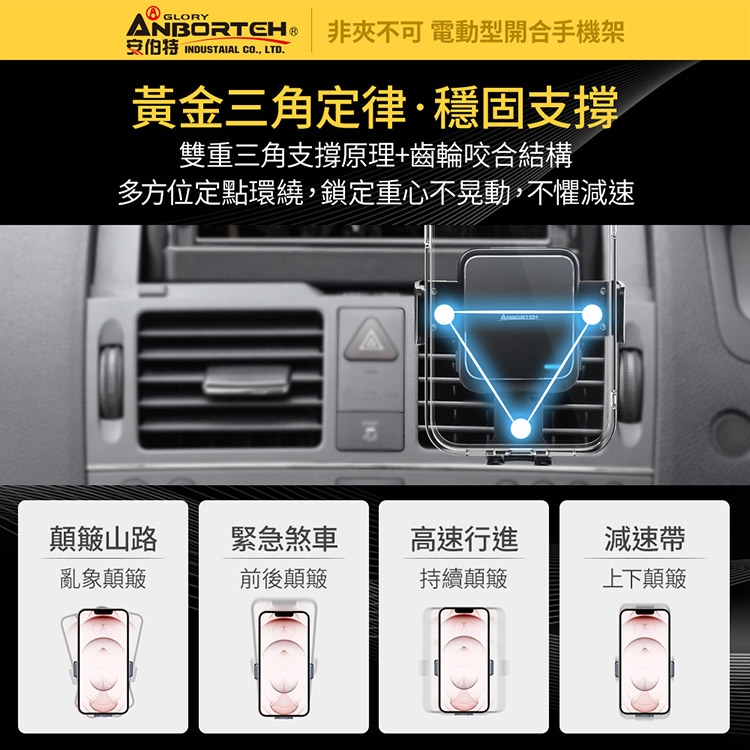 按壓 : 按壓式開啟雙臂,放下手機自動夾緊
