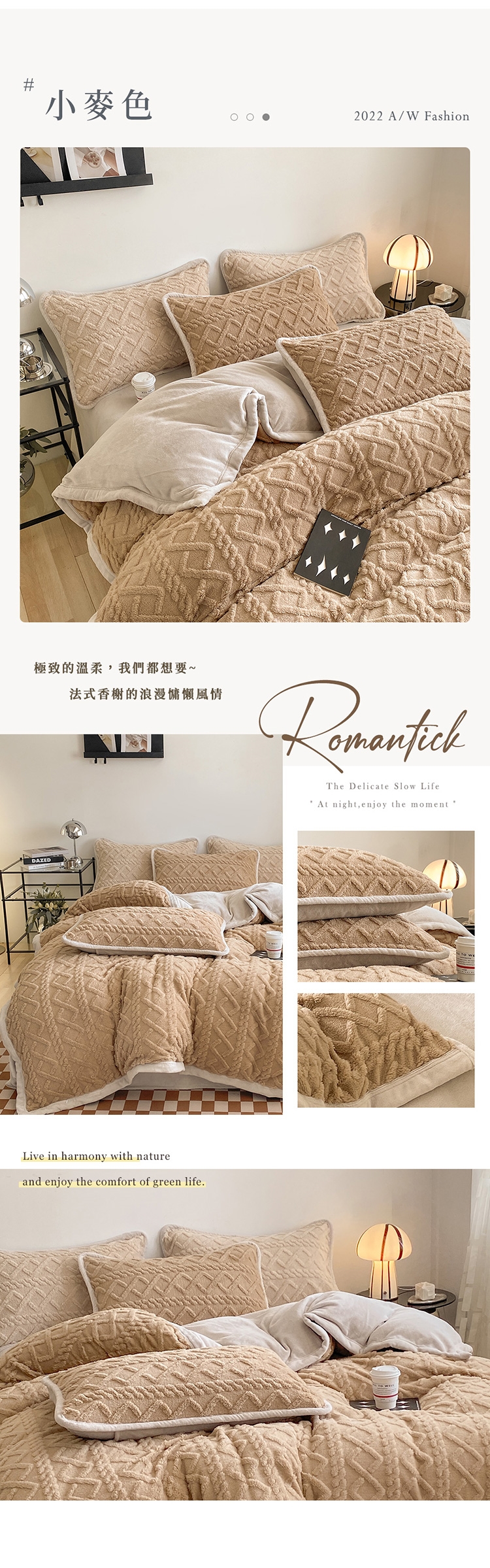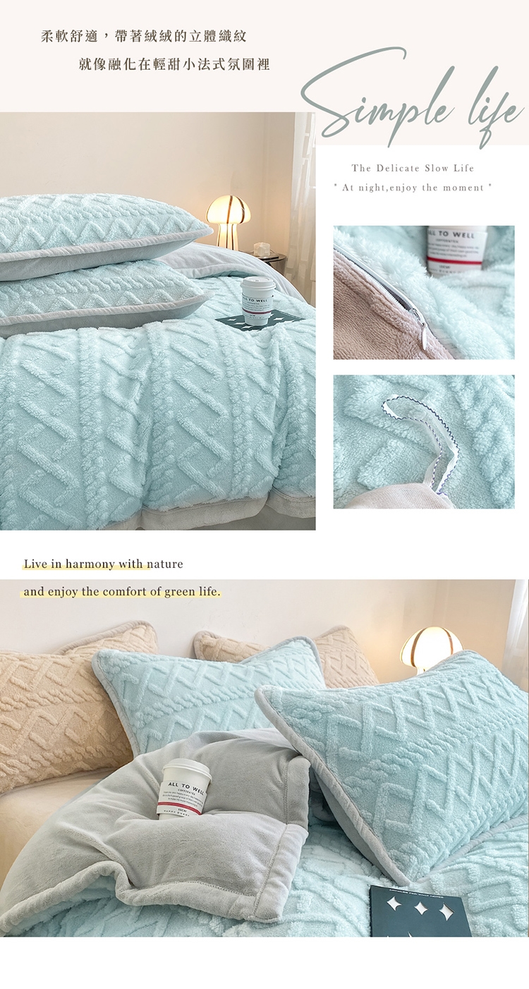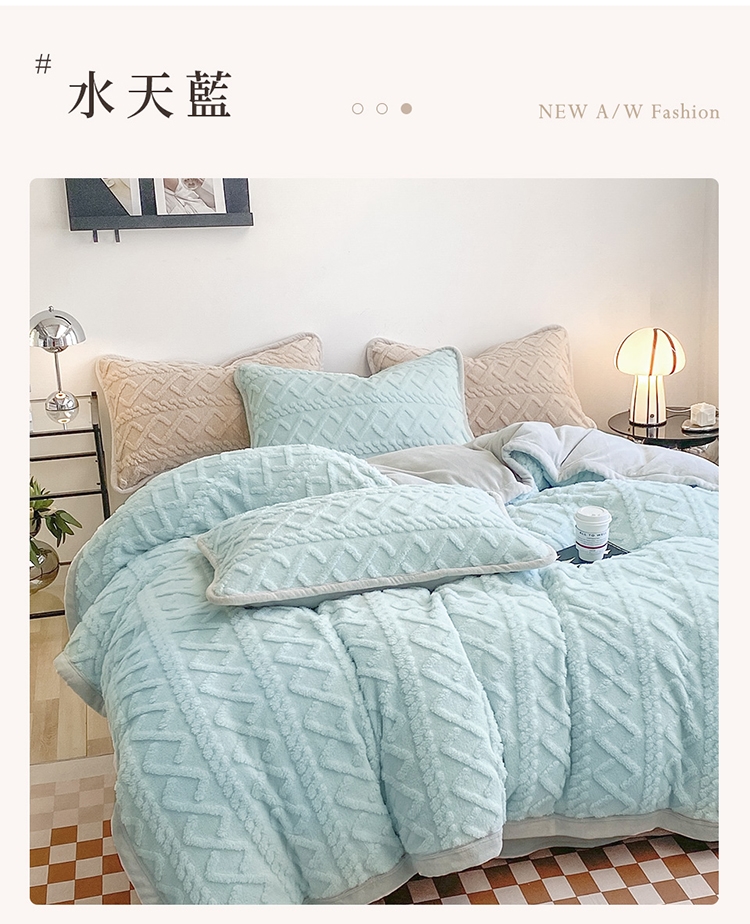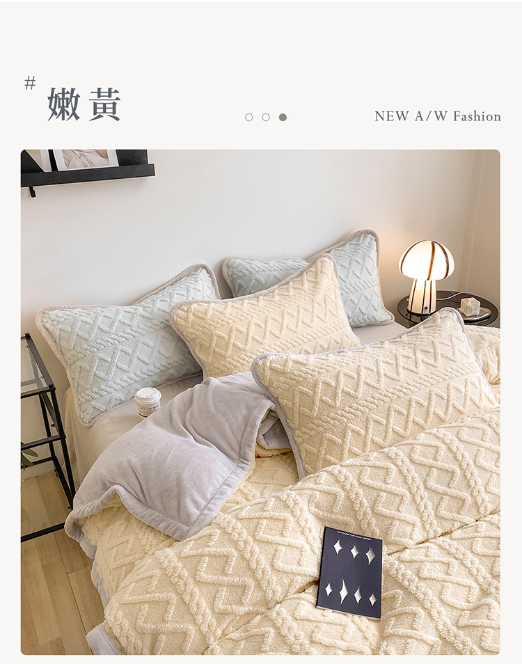 優雅純色寢具 超柔軟親膚觸感,豐厚短絨毛,細膩順滑。入被保暖、熱感蓄溫,有效阻隔冷空氣,溫暖冷冷的冬天。