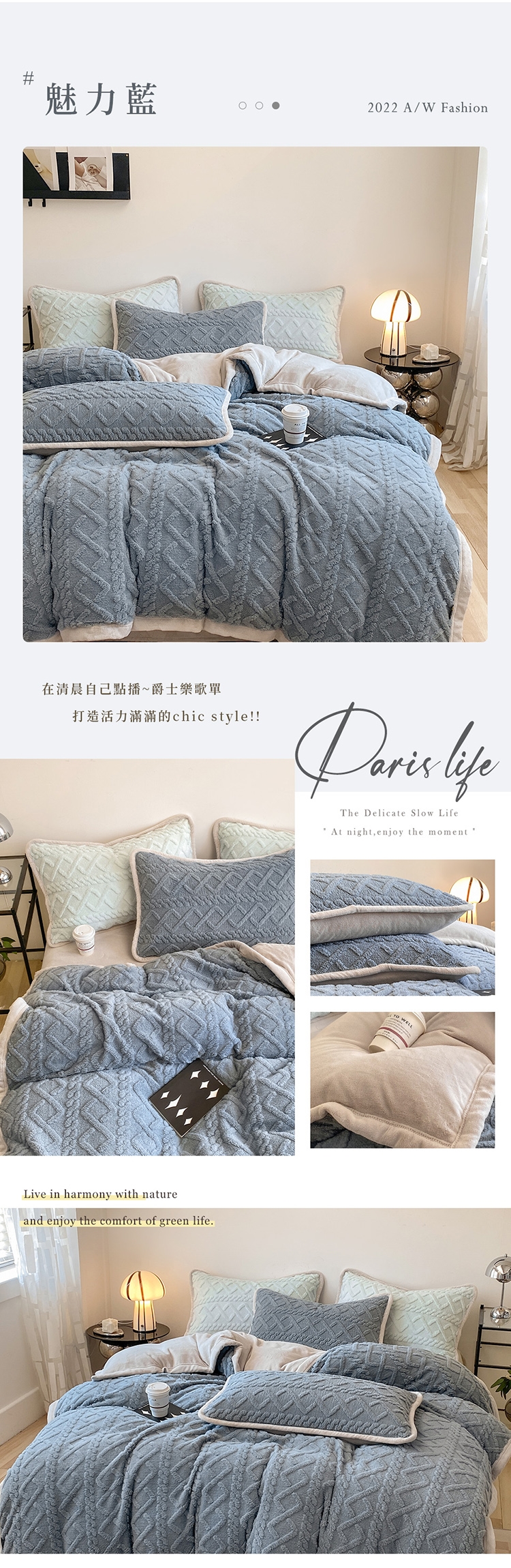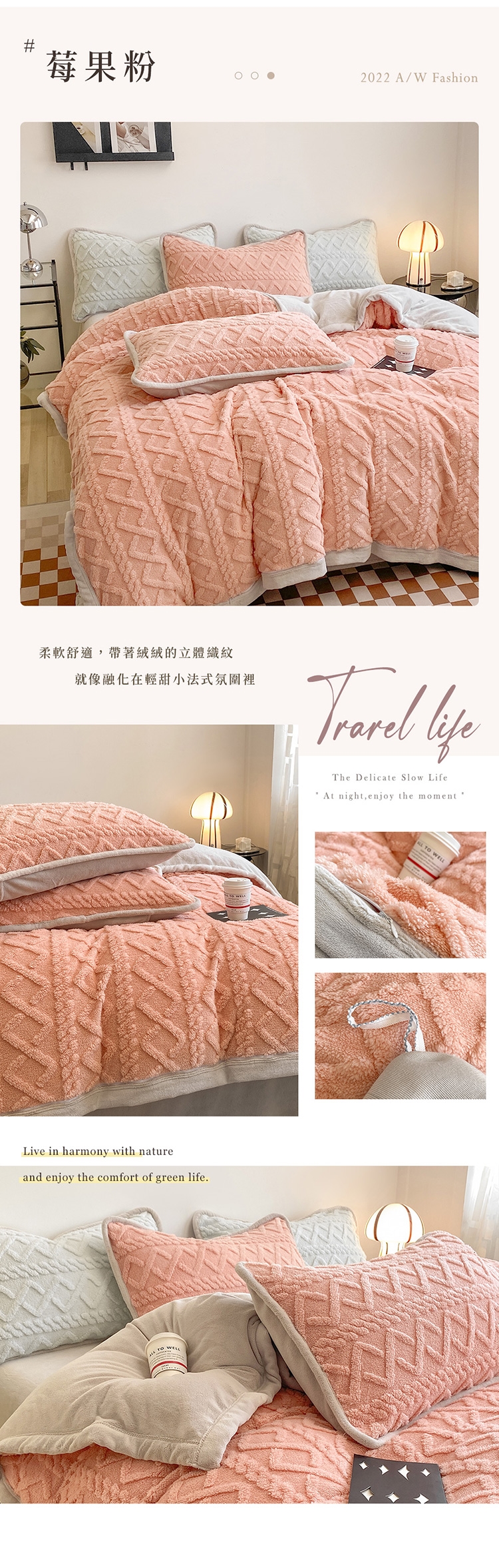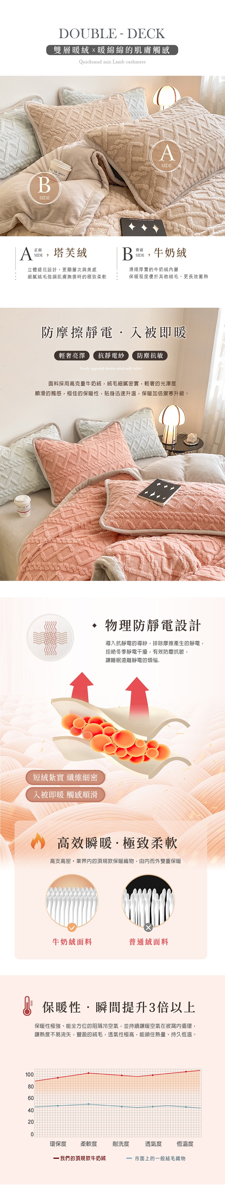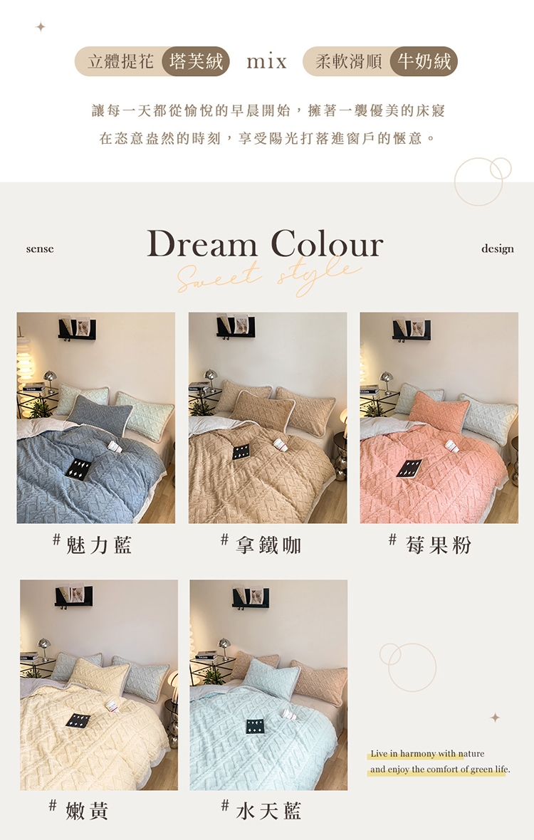 優雅純色寢具 超柔軟親膚觸感,豐厚短絨毛,細膩順滑。入被保暖、熱感蓄溫,有效阻隔冷空氣,溫暖冷冷的冬天。