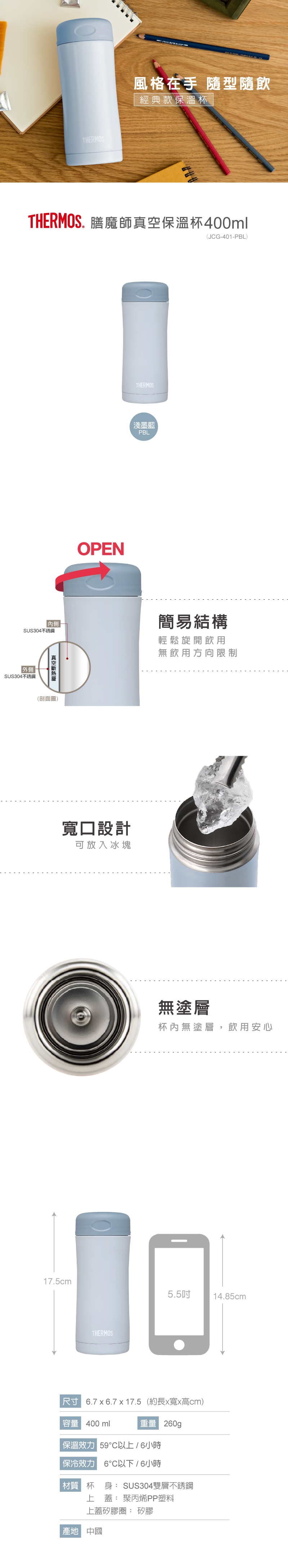 THERMOS膳魔師 不鏽鋼真空保溫杯 0.4L (JCG-400 / 401)
