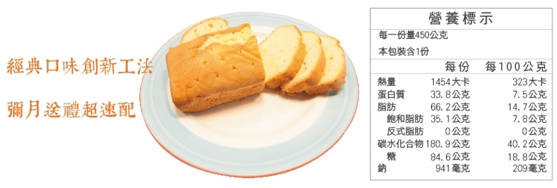 每條鮮檸檬磅蛋糕內含120cc的純正檸檬汁及柳橙汁,