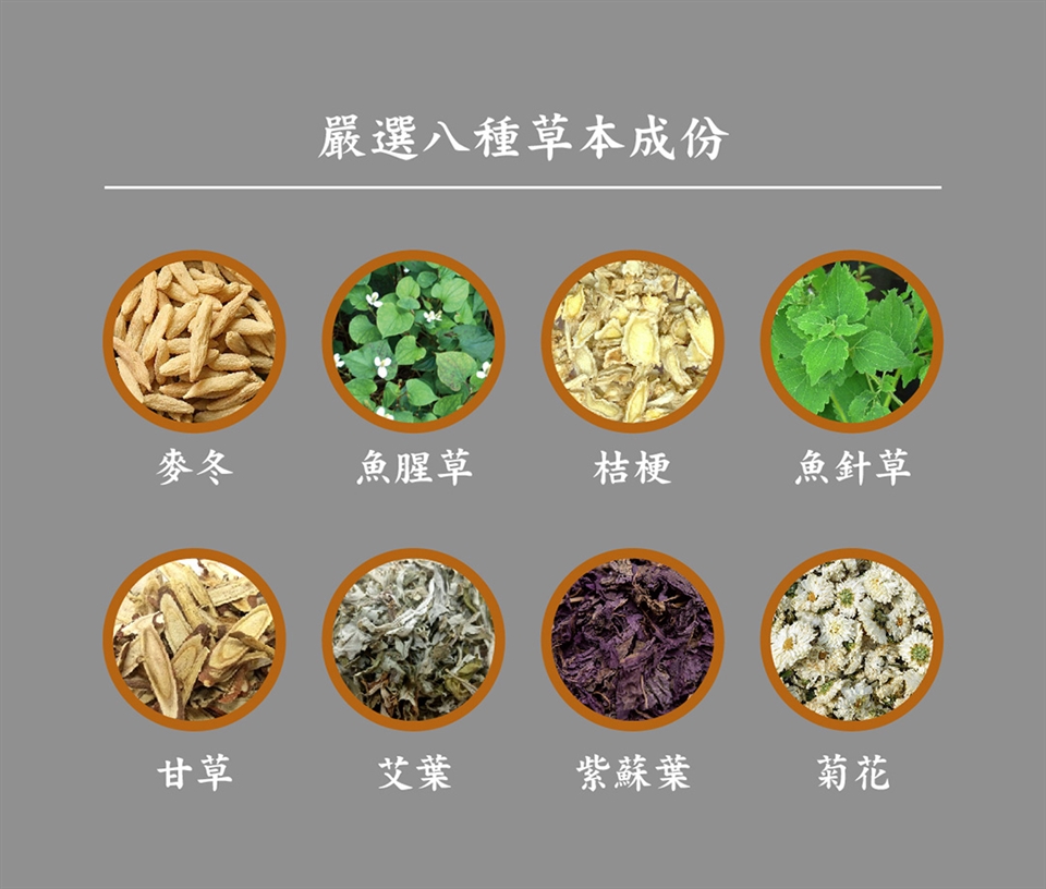 水、艾葉、魚針草、麥冬、魚腥草、桔梗、甘草、紫蘇葉、菊花、維他命C