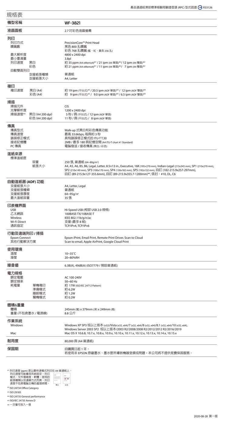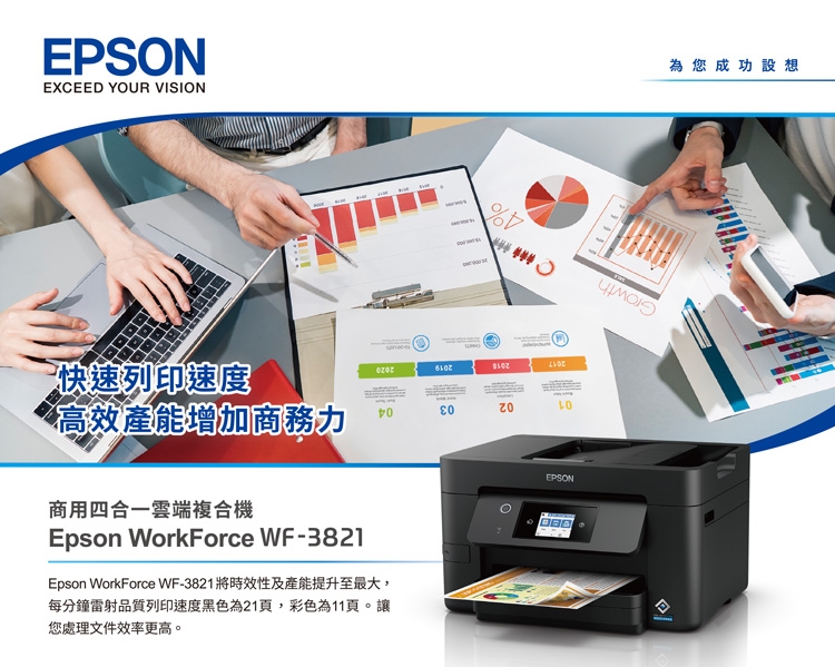 Epson WorkForce WF-3821將時效性及產能提升至最大,每分鐘雷射品質列印速度黑色為21頁,彩色為11頁。讓您處理文件效率更高。