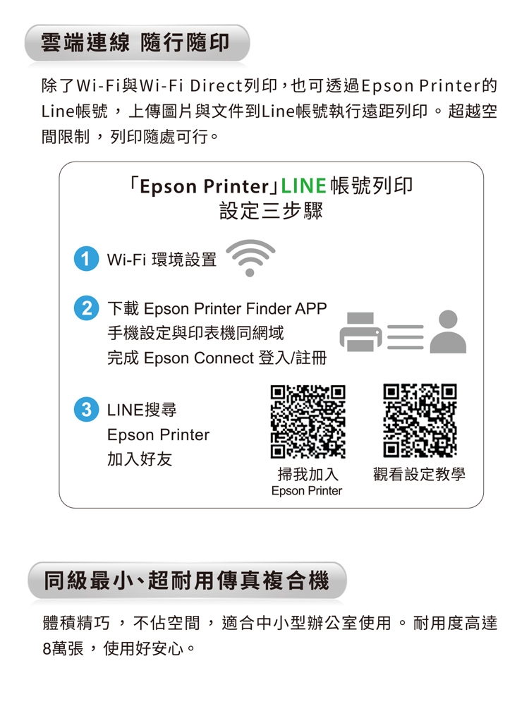 不管是Wi-Fi、Wi-Fi Direct列印,也可透過Epson Printer的Line帳號, 上傳圖片與文件到Line帳號執行遠距列印。超越空間限制,列印隨處可行。