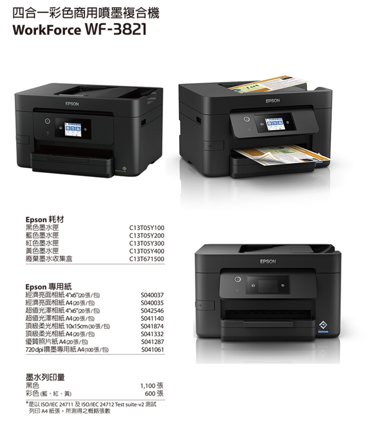 Epson WorkForce WF-3821使用四色防水分離式墨水,缺哪色換哪色。獨家噴頭技術PrecisionCore,墨滴精準,更省墨也提供更佳的輸出品質。搭配新一代魔珠墨水「DURABrite Ultra Ink」,防水、抗光、不暈染、色彩鮮艷,列印品質更臻完美。