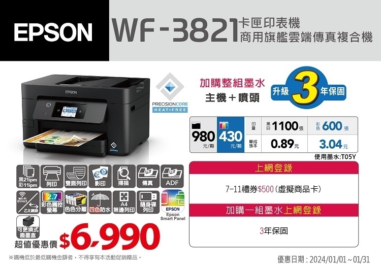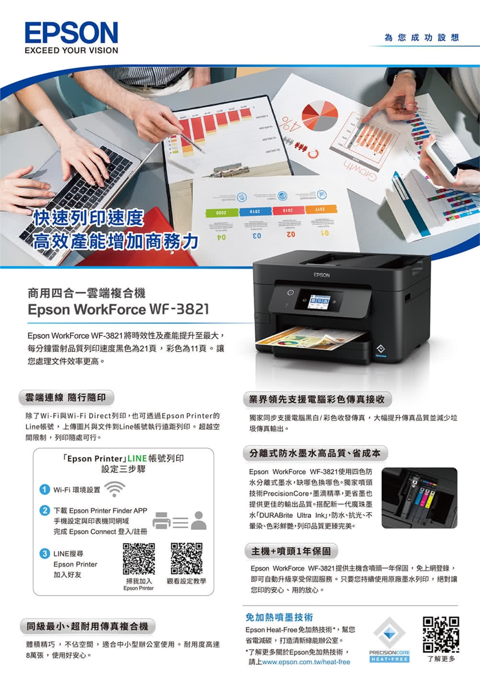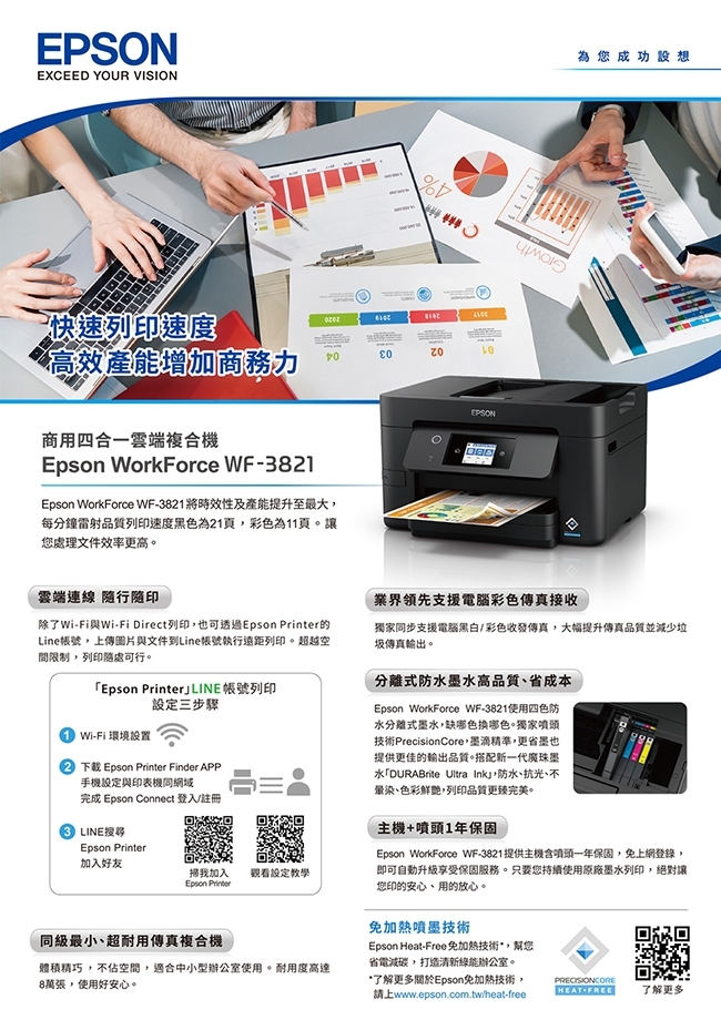 Epson商用四合一雲端複合機WF-3821採用綠色科技Heat-Free噴墨免加熱技術,幫您省電減碳,打造清新辦公室,提升工作品質!