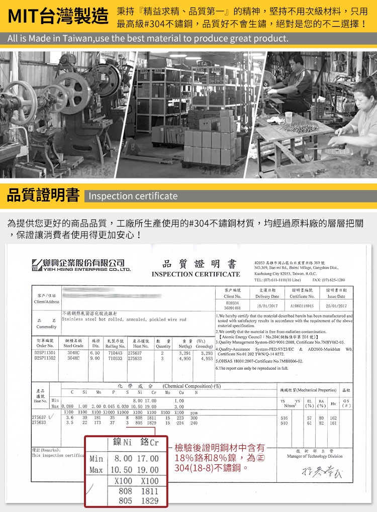 擁有二十幾年外銷經驗,商品深受歐美日等地區肯定,堅持不用次級材料,只選用正統高級#304(18-8)不鏽鋼,品質好不會生鏽,絕對是您的不二選擇!!
