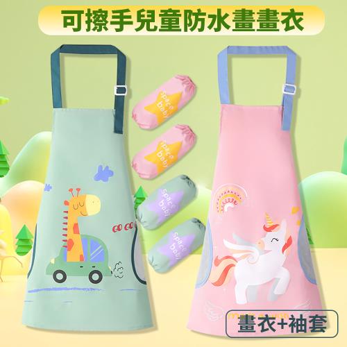 【親親寶貝】可擦手防水防油畫畫衣+袖套(安全材質 兒童圍裙 圍兜衣 吃飯衣)