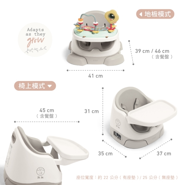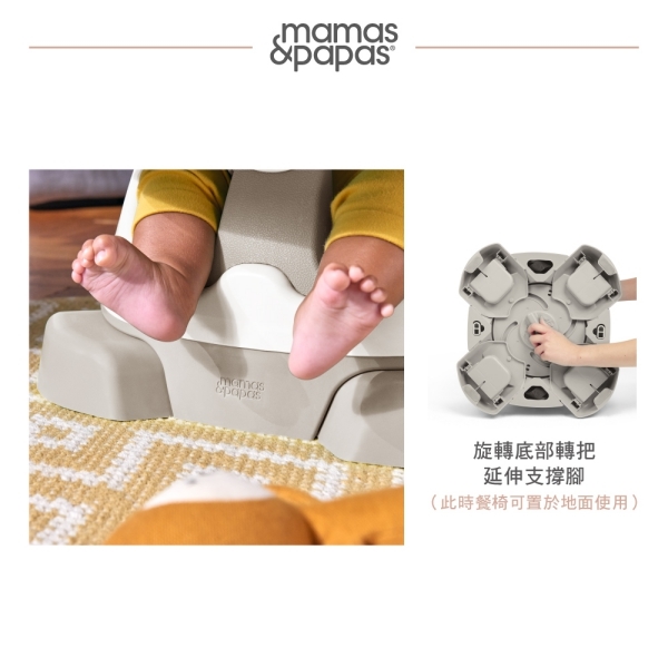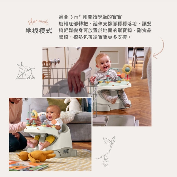 適合 3m+ 剛開始學坐的寶寶,旋轉底部轉把,延伸支撐腳穩穩落地,讓餐椅輕鬆變身可放置於地面的幫寶椅、副食品餐椅,椅墊包覆給寶寶更多支撐。