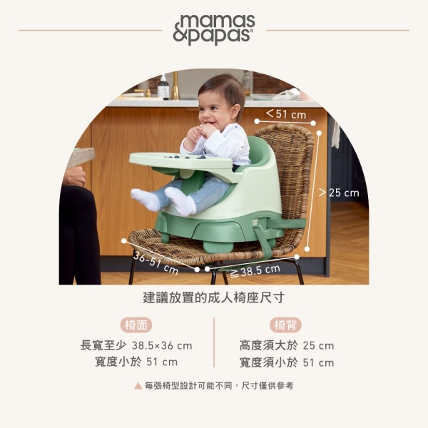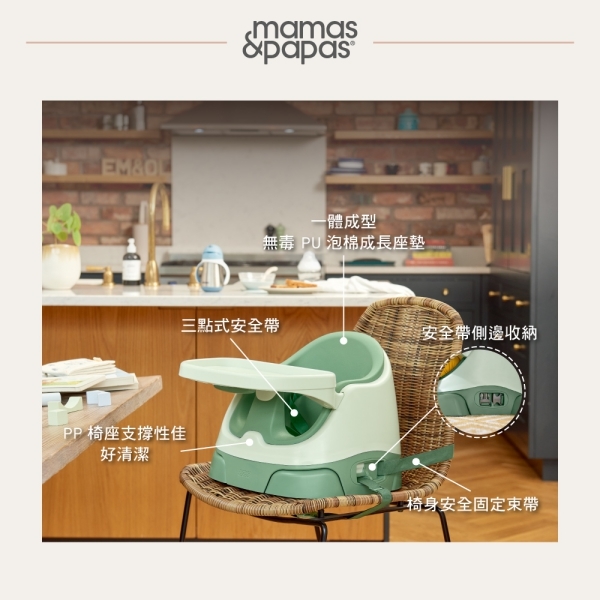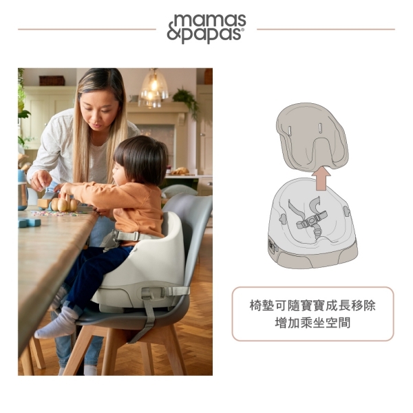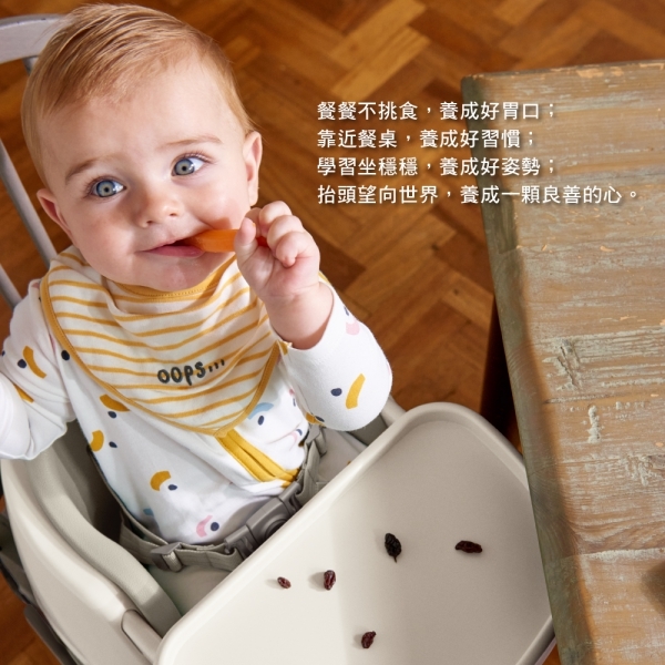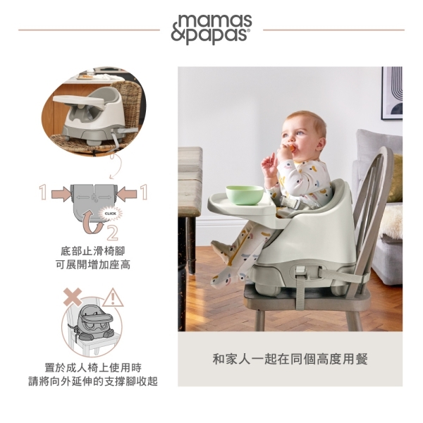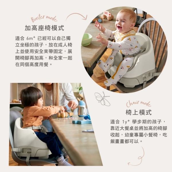 適合 6m+ 已經可以自己獨立坐穩的孩子,放在成人椅上並使用安全束帶固定,展開椅腳再加高,和全家一起在同個高度用餐。