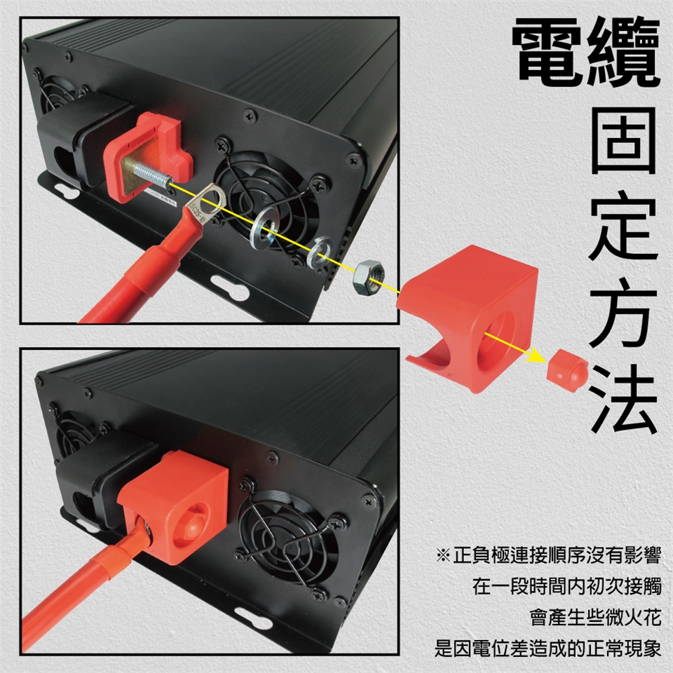 請將12V電瓶(容量最少要200Ah以上)之正負極和電源轉換器的正負極連接,