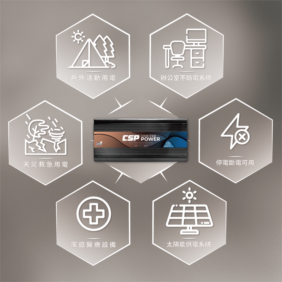 1. 正弦波1200W設計,適用各用高耗能電器。