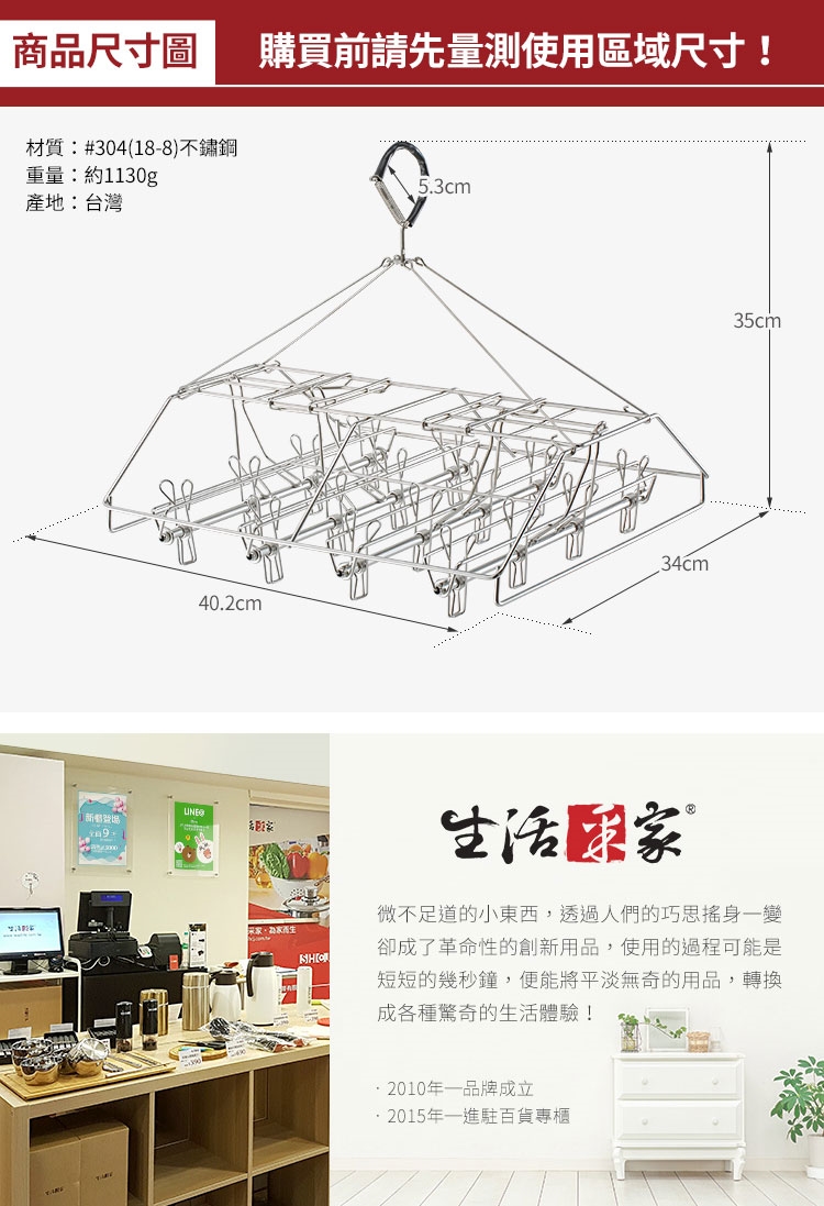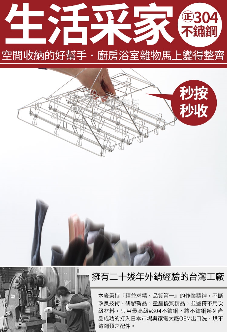 每次收衣服時,總是要花時間一個一個拆下來嗎?20夾要拆20次,30夾就要拆30次,拆得腰都酸了~不僅費時費力,還折騰了自已的身體!不過有了【生活采家秒收系列衣架】只要輕輕一拉,衣服一次幫你收下來,迅速收衣省了一件一件拆收的困擾,晾曬衣物更加輕鬆快速、省時省力。擁有二十幾年外銷經驗,商品深受歐美日等地區肯定,堅持不用次級材料,只選用正統高級#304(18-8)不鏽鋼,品質好不會生鏽,絕對是您的不二選擇!!