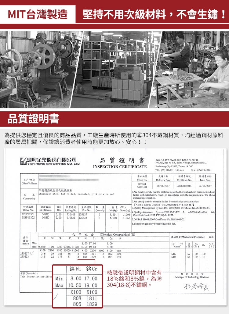 採SUS304 (18-8)高品質不鏽鋼製造,無生鏽疑慮,為同質性產品能找到的最高使用材料等級 ,製造商為已有二十多年經驗的外銷廠商,品質保證。