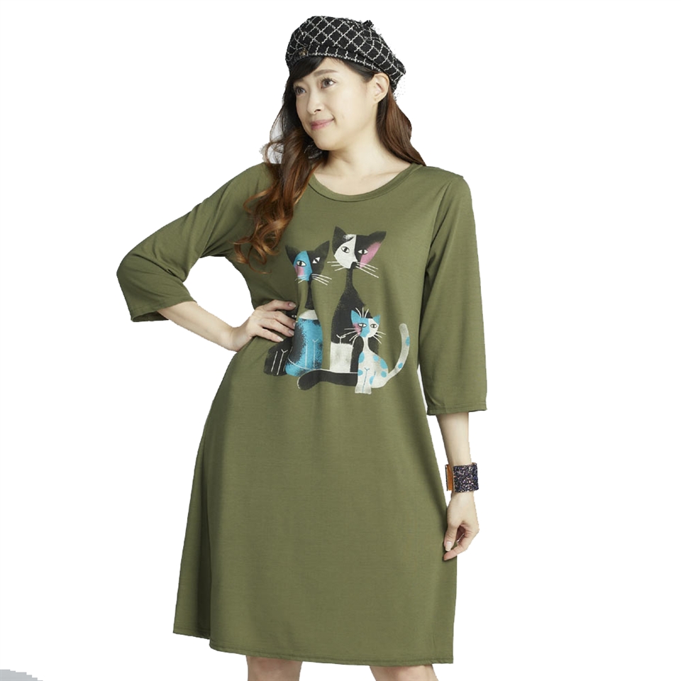04. 舒適的含棉面料加上長版洋裝版型穿著更舒適 !美式圖案及套版印花打造休閒風格 ~更能偷偷修飾小腹~