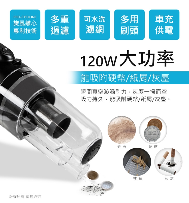 一鍵開關快速方便易使用,120W大功率,灰塵一掃而空,輕鬆清潔。