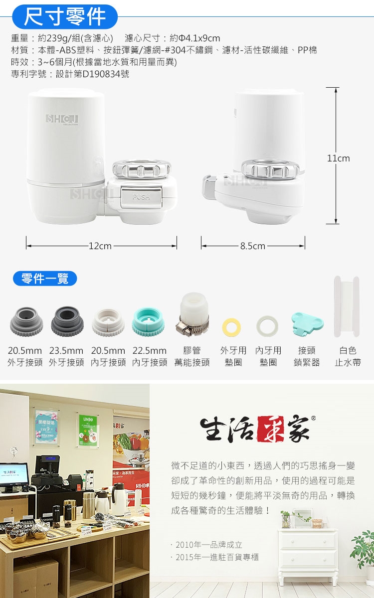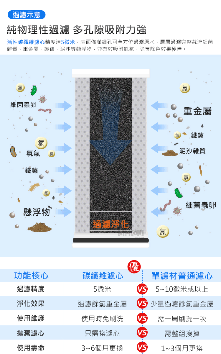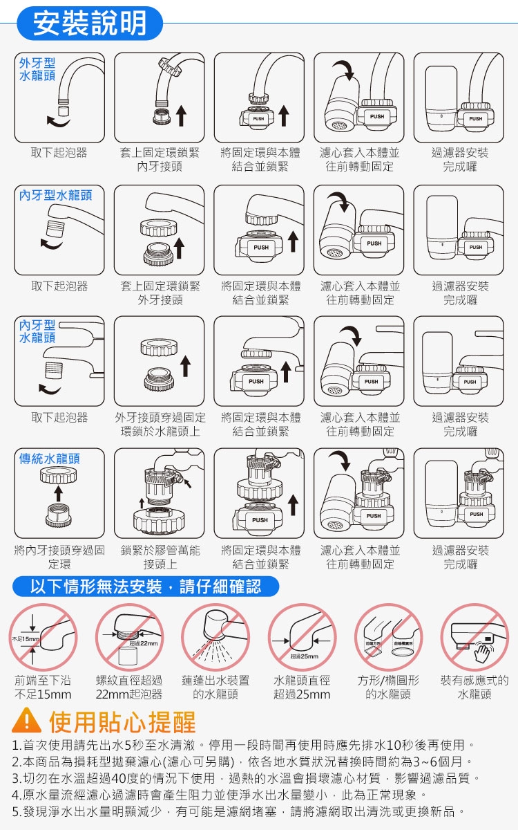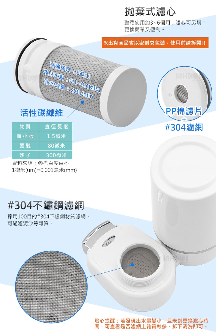 4.本商品為拋棄式濾心,使用壽命依各地水質狀況而異,替換時間約為3~6個月。
