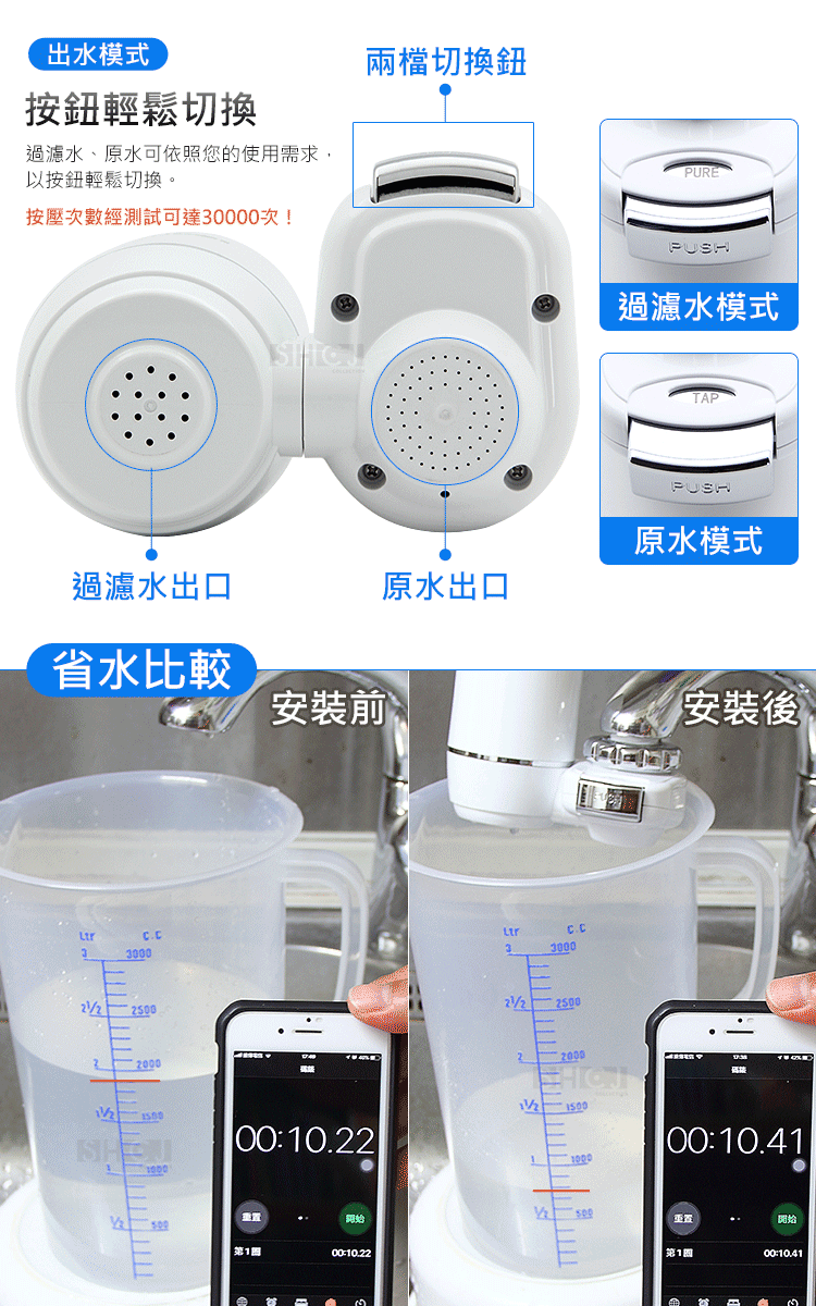 ◆按鍵式切換開關,一按一壓便可輕鬆切換原水或過濾水,按鍵經3萬次以上的按壓測試,品質極佳。
