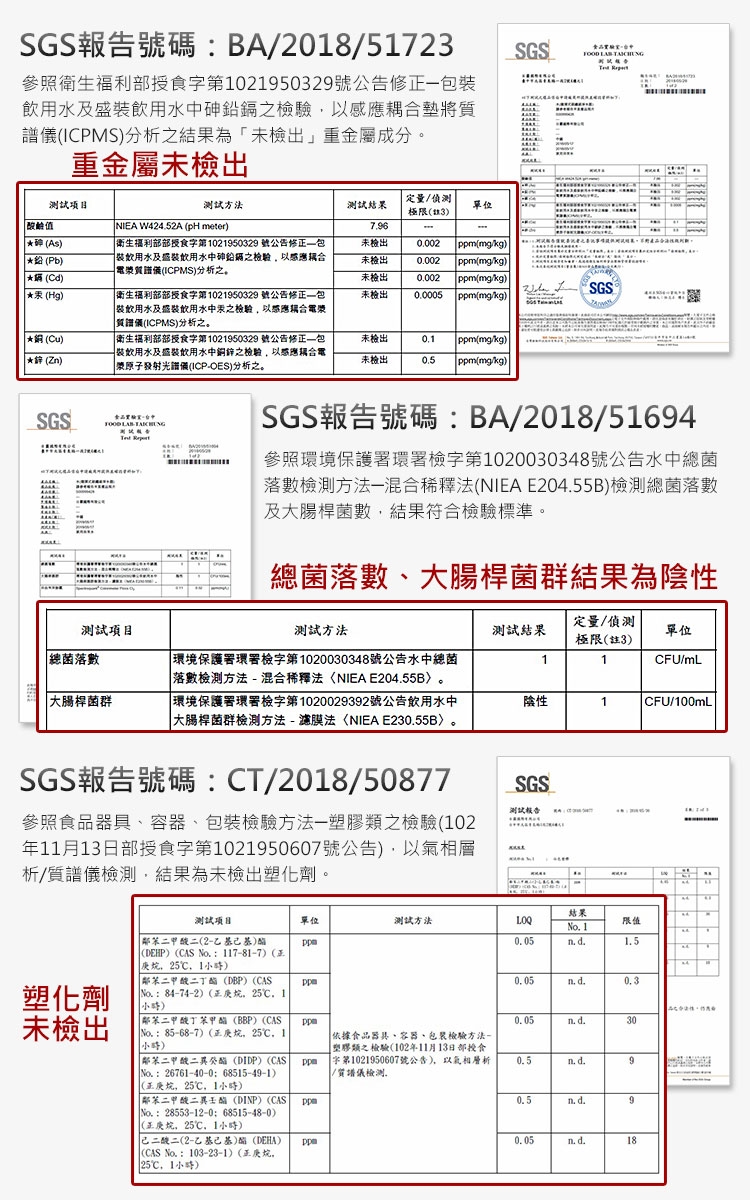 ◆經SGS檢驗重金屬、酸鹼值、菌落數、大腸桿菌群等均合格,出水口塑化劑檢驗合格。