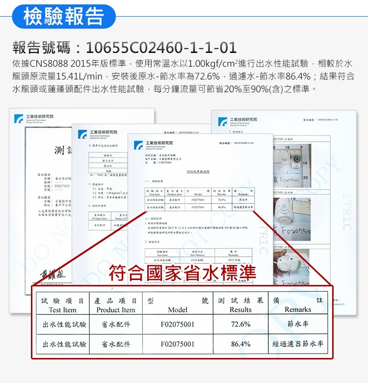 ◆通過工研院檢驗國家級省水標準,能有效節省72%~86%以上的用水量,有效省水、節少水費支出。